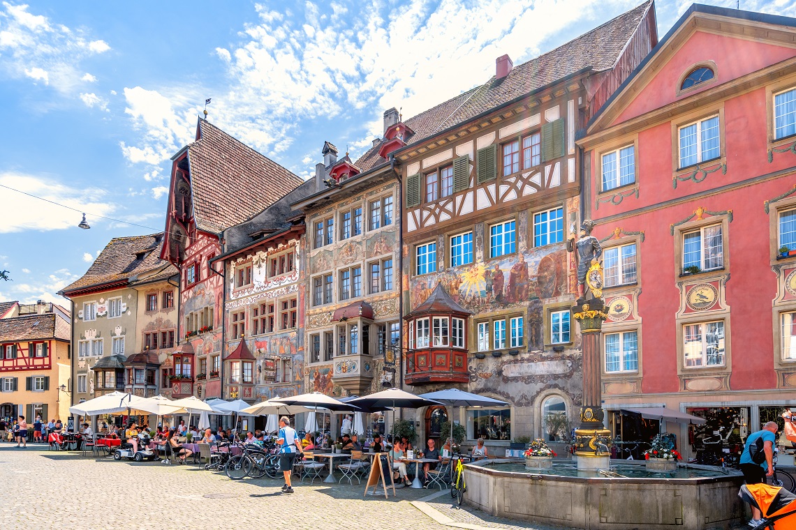かわいらしい壁絵の家並みが残る町シュタイン・アム・ライン。日本語に訳すと「ラインの宝石」と称されるだけあって、メインストリートには16〜18世紀に描かれた壁画に彩られた家屋が並び、優美な雰囲気です。壁絵のなかにはスイスを代表する人気絵本作家カリジェが手掛けた壁画も見られます。