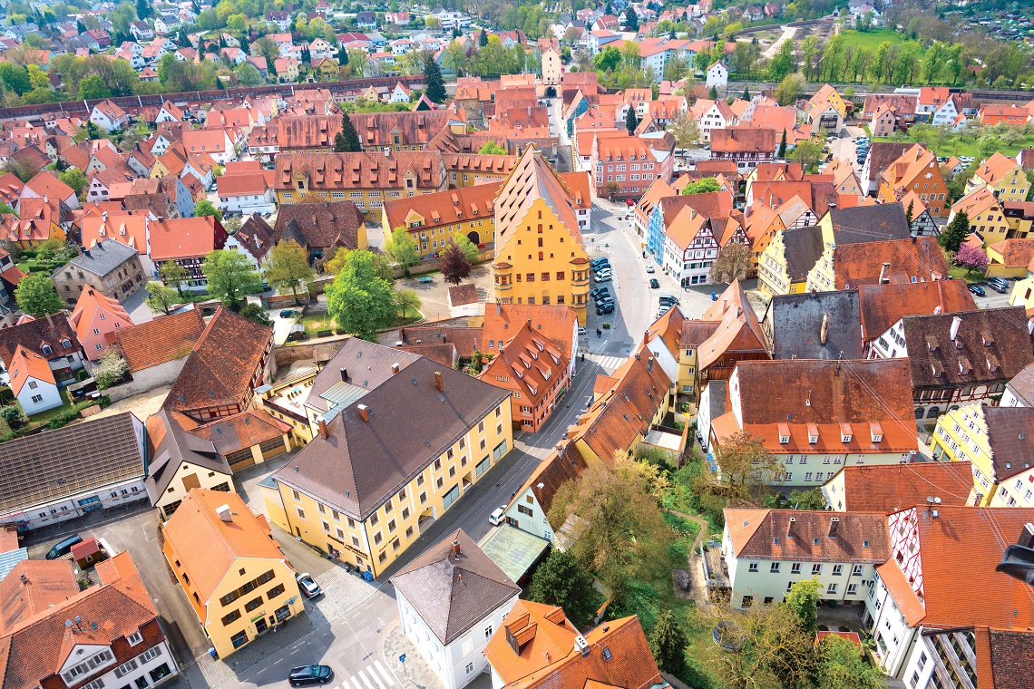 中世ドイツに一定の自治権を得た自由都市であり、ロマンチック街道の町の一つ。町は隕石の落下によってできた盆地に築かれ、城壁もほぼ完全な状態で残されています。中世の建物が手入れされながら残されており、町の中心に位置する教会の塔に階段で昇ると、赤茶色の屋根が連なる町の雰囲気も望めます。