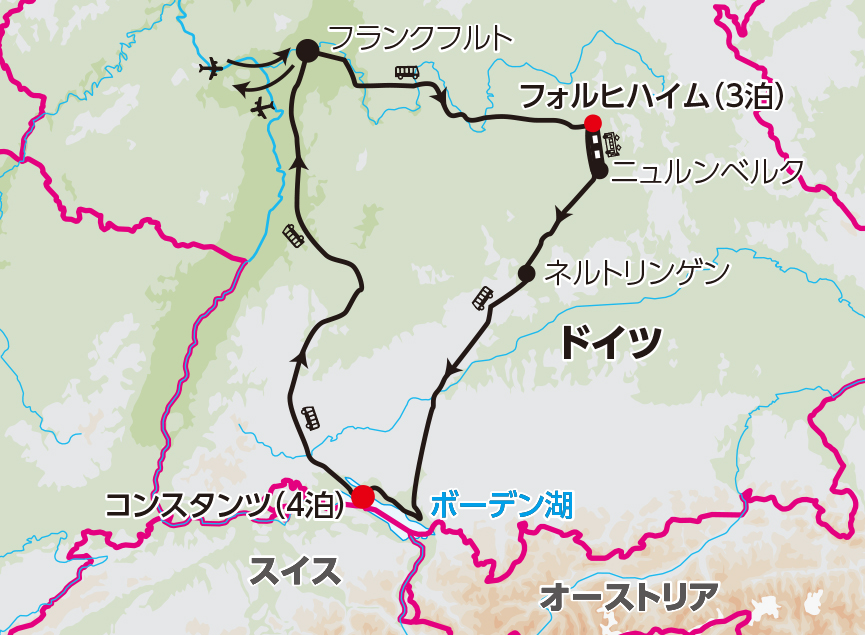 - ボーデン湖畔コンスタンツの上級ホテルに4連泊し、飛行船「ツェッペリン」遊覧飛行や「花の島」マイナウを訪ねます。