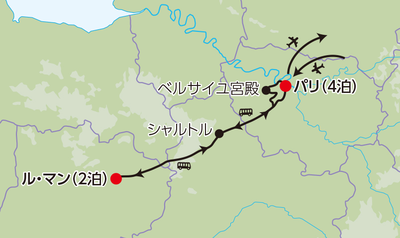 - 中世建築の傑作シャルトル大聖堂やベルサイユ宮殿など、移動中に立ち寄る魅力的な見どころを通してフランスの奥深さを感じる旅です。
