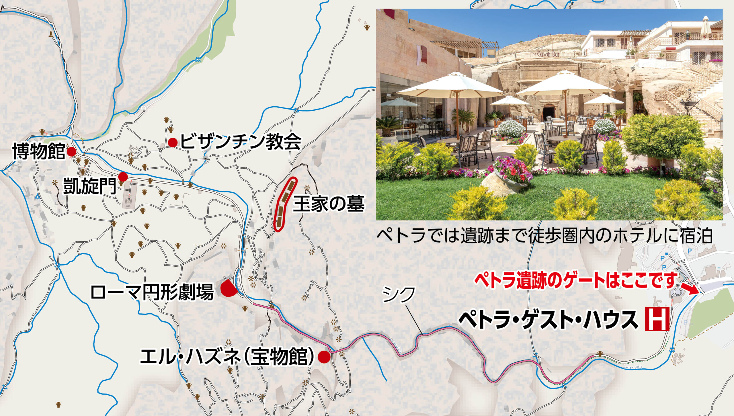 ペトラでは遺跡から徒歩圏内のホテルに連泊し、じっくりと遺跡を見学