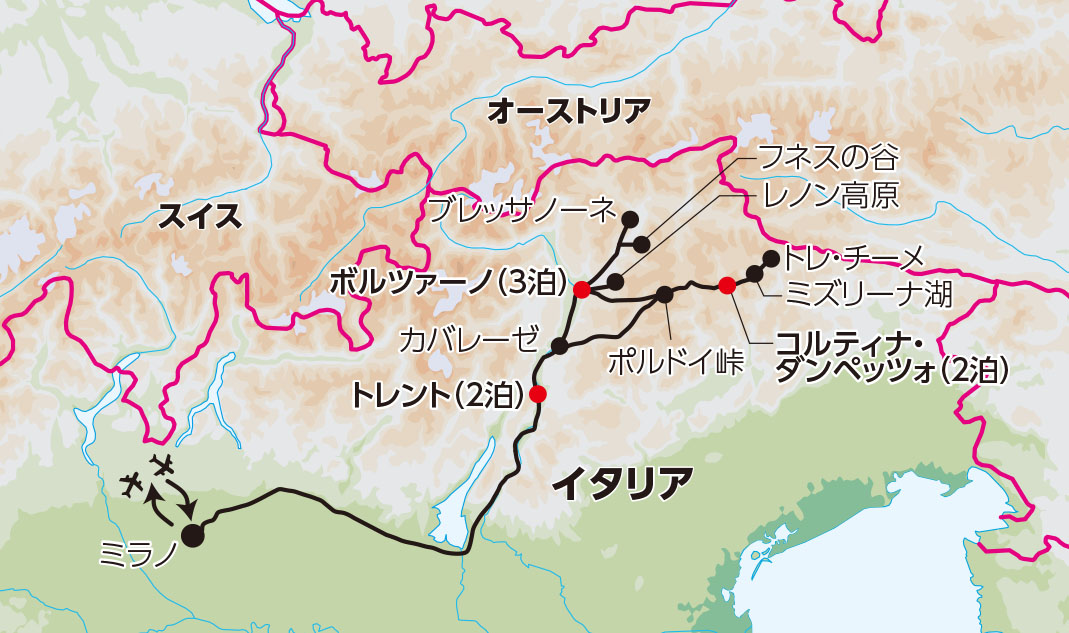 - ドロミテ観光の拠点となるボルツァーノとコルティナ・ダンペッツォに計5泊し、様々な角度から絶景を楽しみます。
