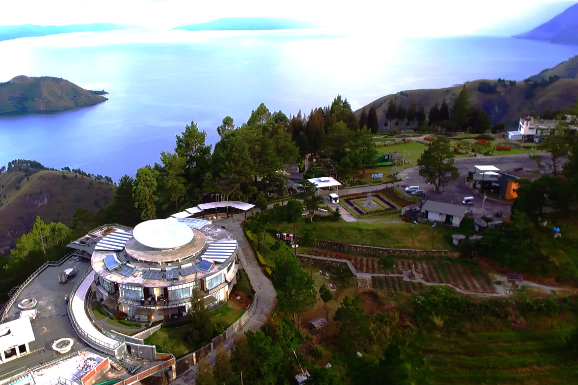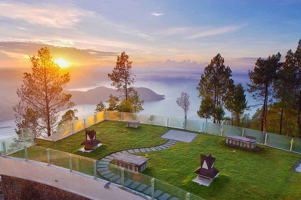 秘境ともいえるトバ湖ですが、避暑地としてリゾートホテルの整備も進んでいます。今回の宿泊はトバ湖を見下ろす高原に位置する「タマン・シマレム・リゾート」。標高1,200メートルの涼やかな空気と、息を呑むような湖の眺望が魅力です。有機農園や果樹園、茶畑、コーヒー農園も併設する、広大なつくり。ホテル敷地内のテラスからの眺望は見事で、条件が許せば朝霧が雲海のように広がる中に浮かぶ日の出という、幻想的な景観もお楽しみいただけます。