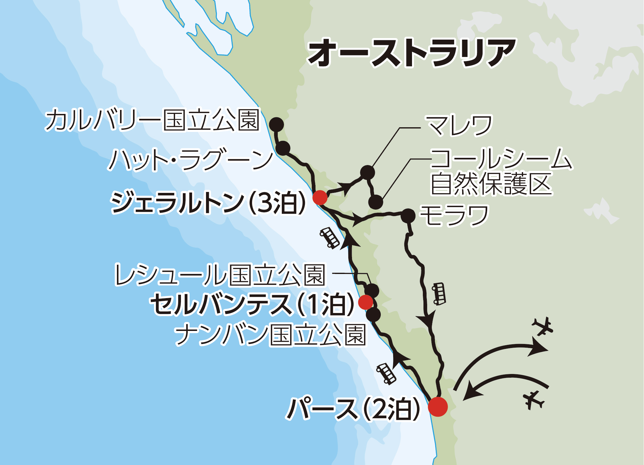 オーストラリアでは桜前線ならぬワイルドフラワー前線が7月上旬から約5か月かけて北から南へ南下していきます。そのシーズンに合わせて国立公園や保護公園を訪ねます。パースから日帰りでフラワーウォッチングに出かけるツアーが多いなか、このコースではゆとりをもってフラワーウォッチングを満喫できるよう、ワイルドフラワー観光の拠点として、パースの北約400㎞に位置する町ジェラルトンで3連泊し、4日間に分けてご案内します。
