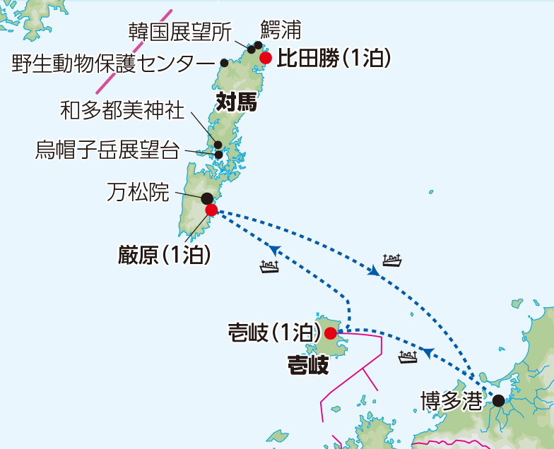 - 対馬の比田勝と厳原に宿泊し、対馬博物館をはじめ、上対馬、下対馬の両方の見どころにご案内します。