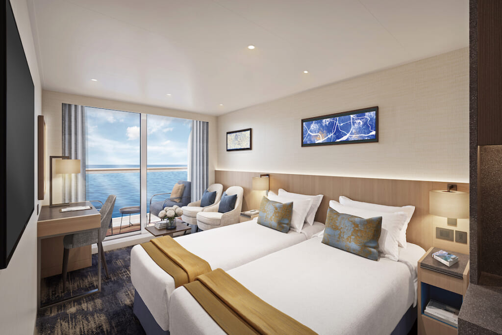 飛鳥Ⅲの客室は全てバルコニー付き。日本人の生活スタイルに合わせ、ゆったりと湯に浸かれるバスタブや飛鳥クルーズオリジナルの「シモンズ」のベッドマットレス、クローゼット、キッチンシンク付きのミニバーも備えています。