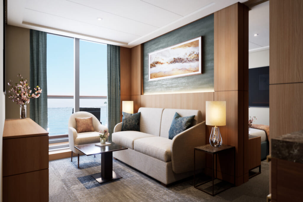 リビングとベッドルームが仕切られたゆとりある空間。レストランや寄港地観光の先行予約が可能です。