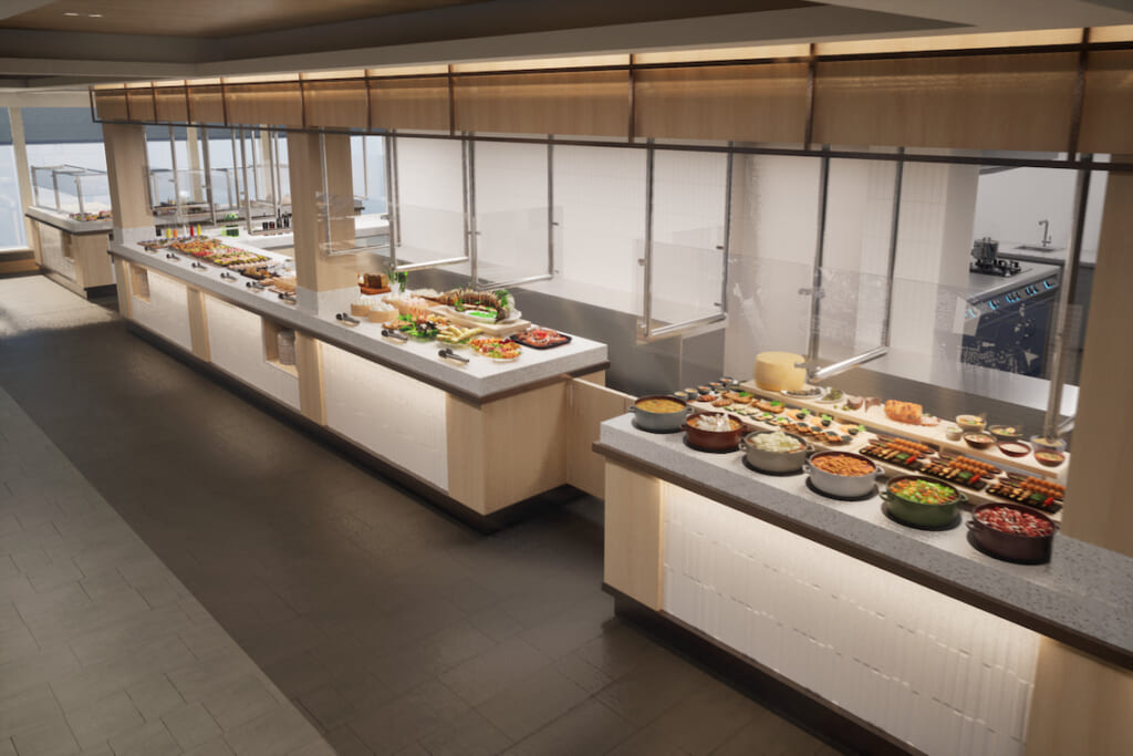 開放感があるスタイリッシュな空間に世界各地の名物料理が一堂に会する「飛鳥ビュッフェ」。レストラン名は飛鳥Ⅲが誕生したドイツ北部を流れるエムス川が由来です(予約不要、無料)。