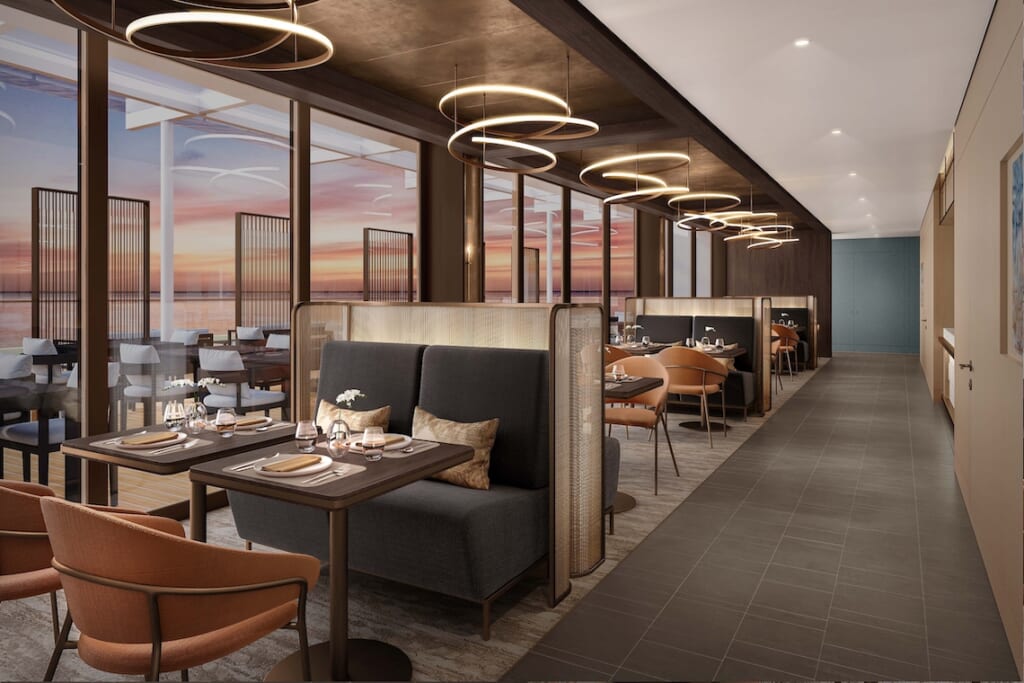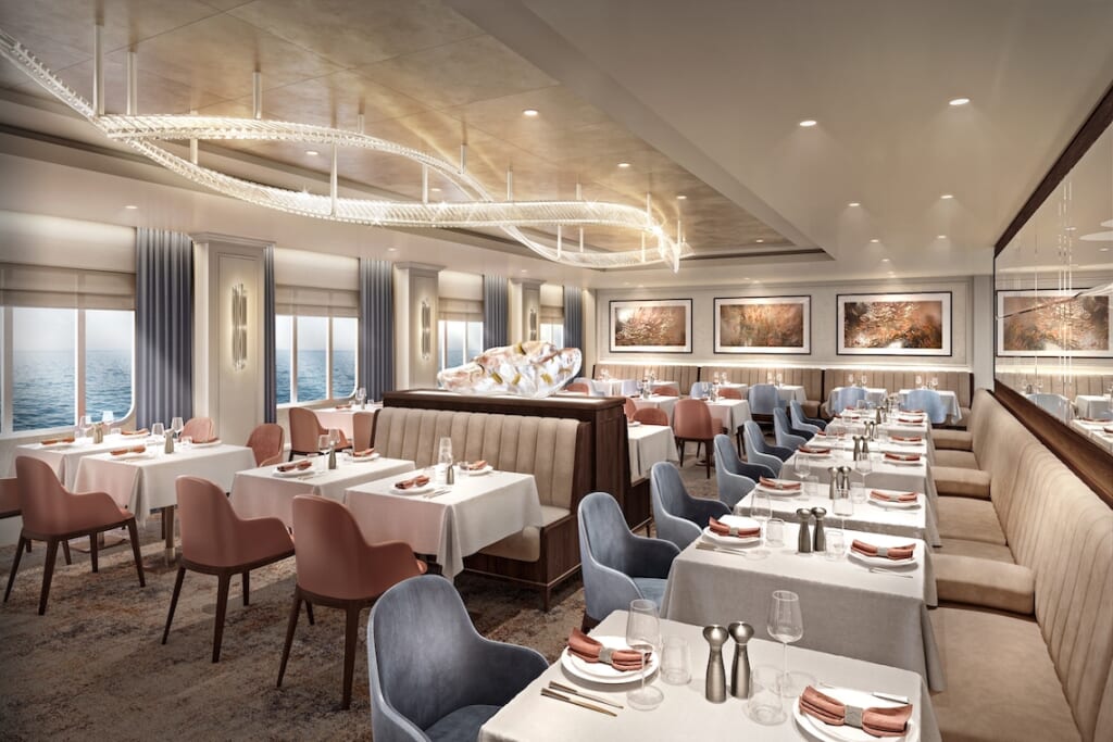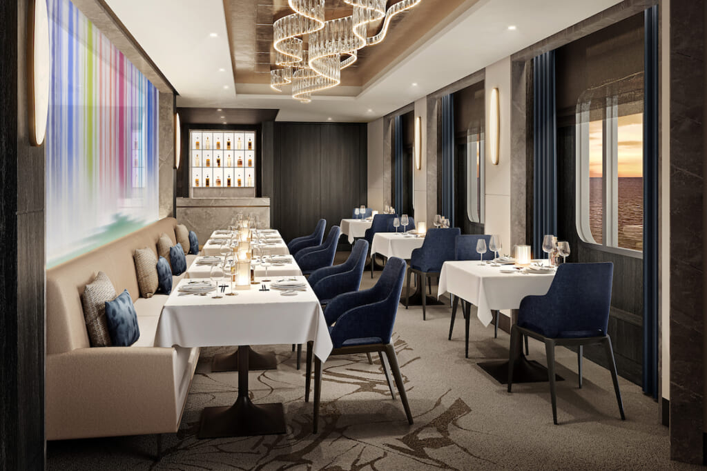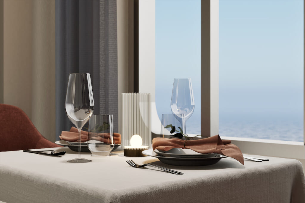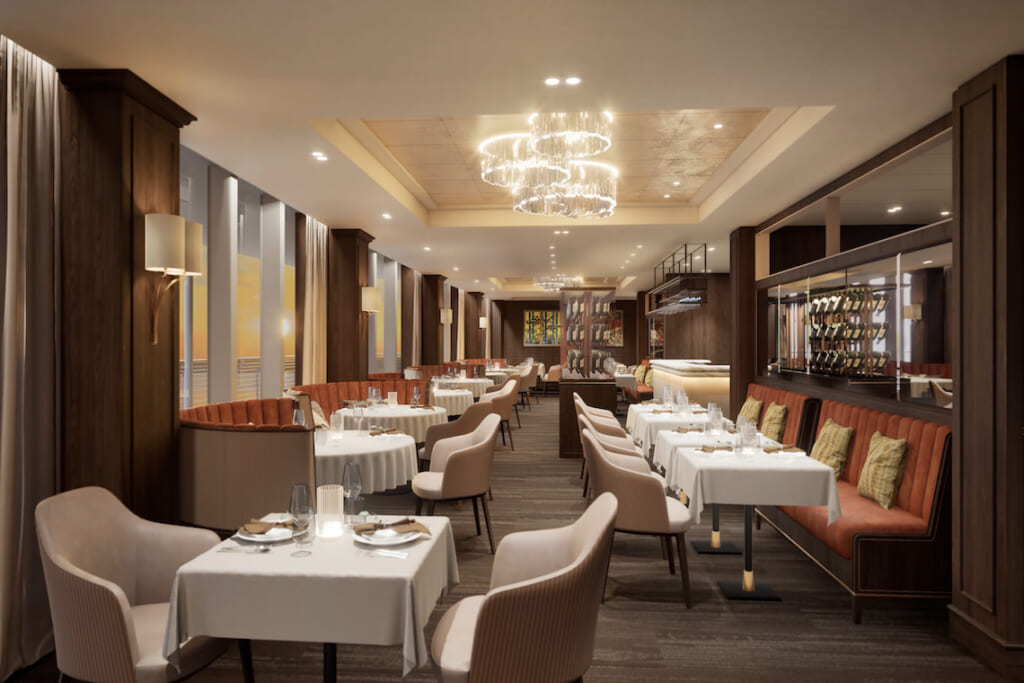 飛鳥Ⅲのシグネチャーレストラン。厳選した食材を「飛鳥キュイジーヌ」に仕上げる上質なフレンチをお楽しみいただけます(予約制、無料)。