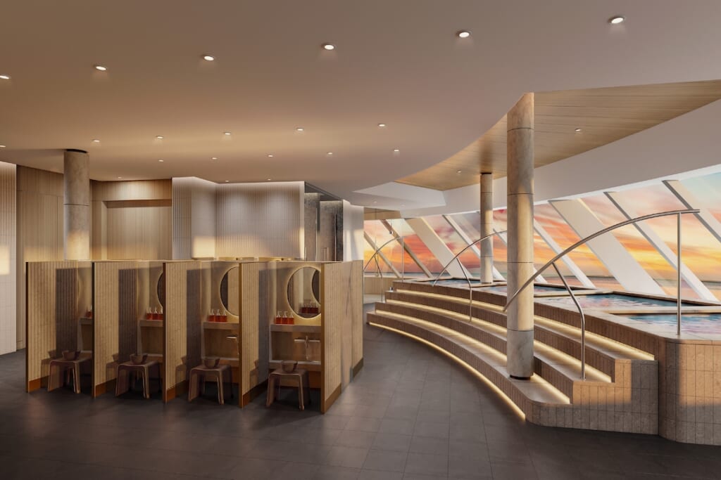 船首に位置する「グランドスパ(露天風呂)」は、日本船ならではのおもてなし。内湯は4つ、外湯3つとサウナもあります。露天風呂からは移り行く大海原を眺めながらゆっくりと湯に浸かれます。また「スタジオA3」では、レベル別にヨガをはじめとするウェルネスプログラムや講座が開催されます。