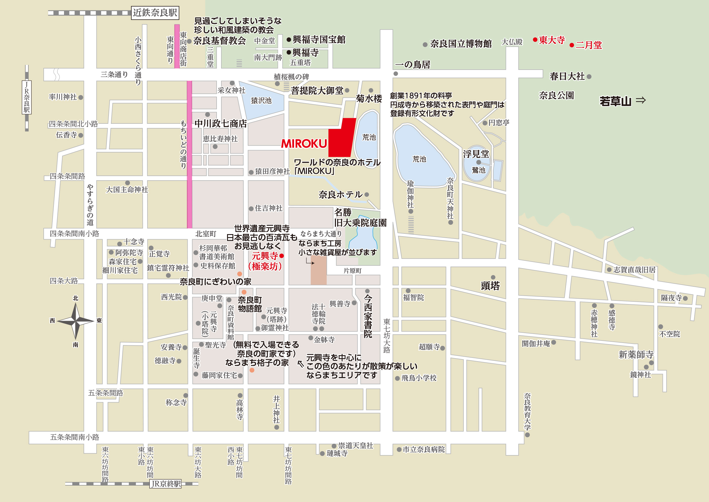 ■午前、ナビゲーター(語り部)の倉橋さんによる解説とともに、奈良の古い町並みが残る○奈良町、世界遺産の●元興寺をご案内します。 ■その後、午後の出発まで奈良町にて自由行動。昼食や老舗でショッピングなど、歴史ある奈良町でのひとときをお過ごしください。 ■午後、和空法隆寺へ。 ■夕食後は、ホテルが主催する歴史や文化のトークショーをお楽しみください。 【2連泊】斑鳩:門前宿 和空 法隆寺泊) |