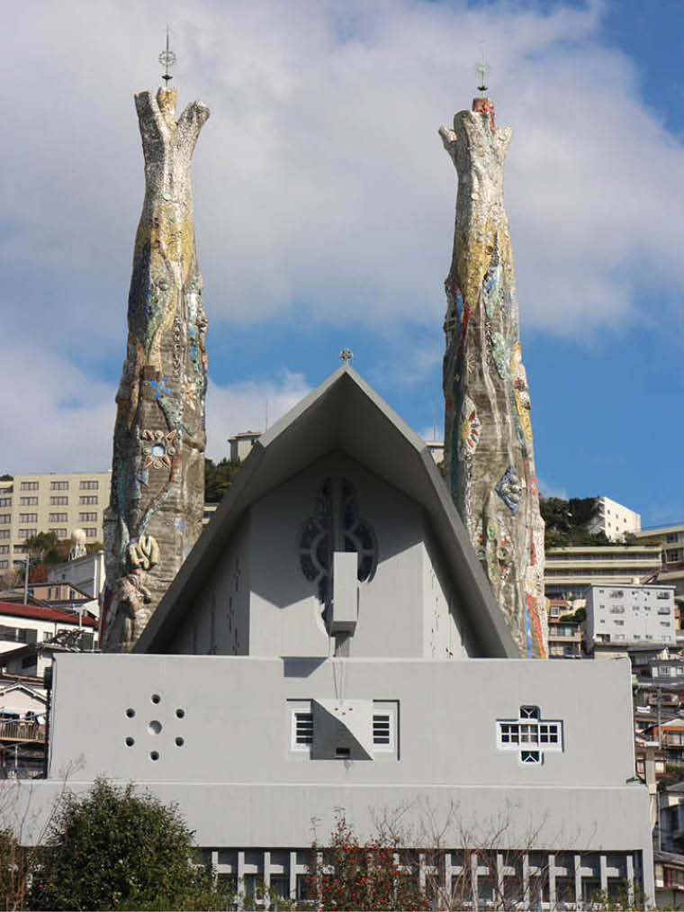 日本のゴルゴダの丘といわれる西坂の丘。現在この丘には聖フィリッポ教会(西坂教会)と、日本のキリスト教の歴史を紹介する、日本二十六聖人記念館が建てられています。聖フィリッポ教会は二十六聖人のひとり、フェリペ・デ・ヘススの祖国メキシコからの寄付のもと、ガウディを日本に紹介した建築家、今井兼次さんの設計により建てられ、「日本のサグラダ・ファミリア」とも呼ばれています。