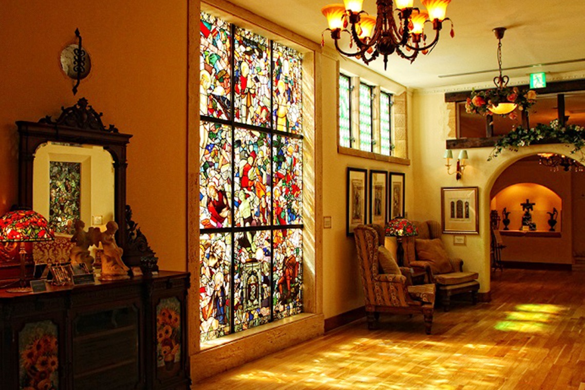 川奈の高台に建つ礼拝堂のような建築が特徴の川奈ステンドグラス美術館では、19世紀のアンティークから現代までのステンドグラス約300点を展示しています。各所に配されたステンドグラスは、時刻や天候とともに刻々と色合いや姿を変え、いつ訪れても美しい姿を見せてくれます。今回は美術館併設のレストラン「ラ・ヴィータ」にてコースランチをご用意しました。