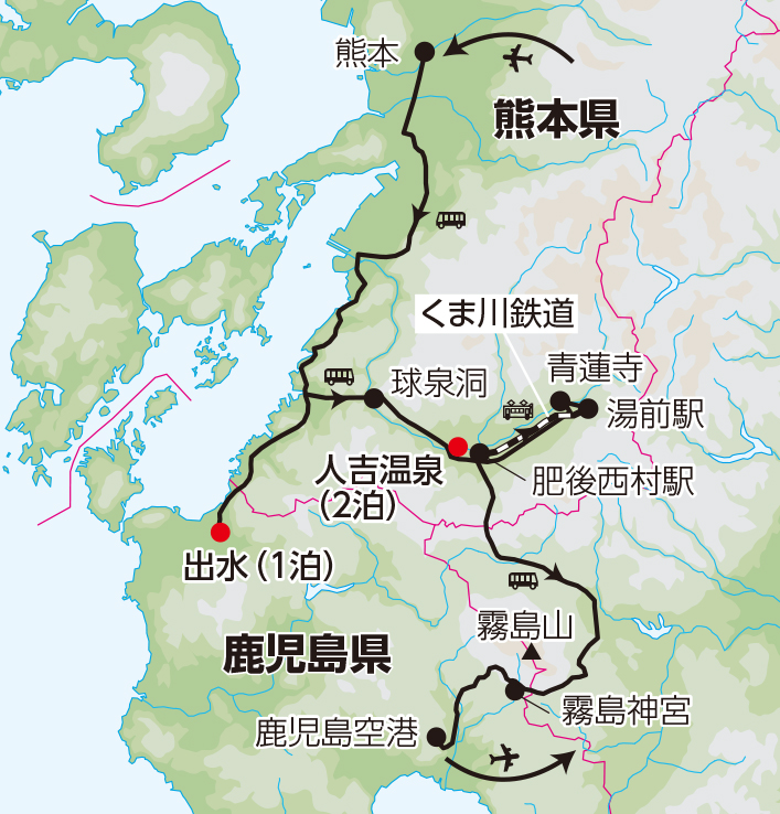 ■午前、国宝の○青井阿蘇神社を参拝。○武家屋敷などを見学します。 ■午後、肥後西村駅から湯前駅まで、豪雨災害からの全線復旧に向け活動する「くま川鉄道」の乗車体験にご案内します。 ■その後、重要文化財に指定された○青蓮寺へ。 (人吉温泉泊) |
