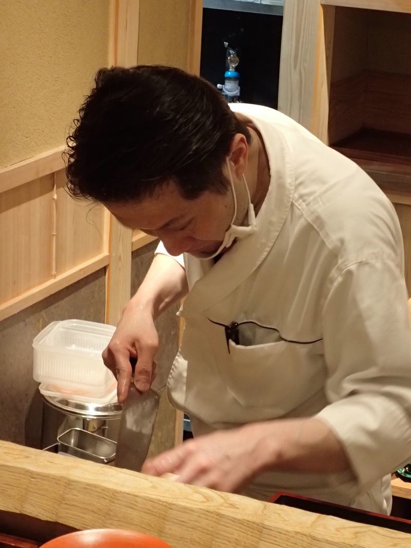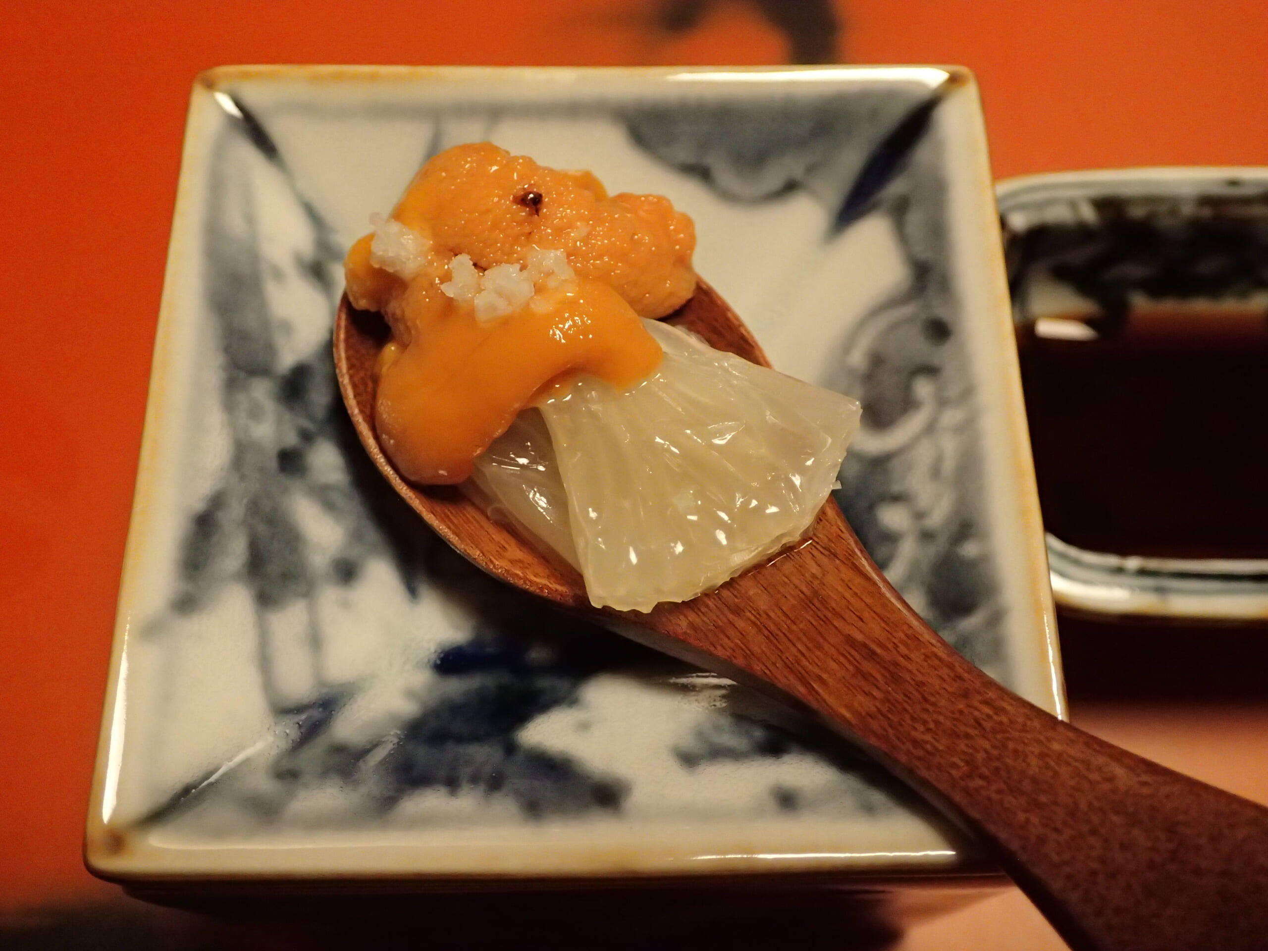 - 愛媛・松山では海外の評価も高い「草庵 田なか」へ。見た目も美しく、お酒とのペアリングも絶妙です。