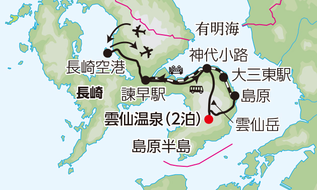 ■午前、バスにて島原市内へ。 ■着後、●島原城、○武家屋敷群、●湧水庭園四明荘などを見学します。 ■昼食後、島原港駅より諫早駅まで、有明海を望む絶景ローカル線、島原鉄道の旅をお楽しみください。 ■諫早駅より、長崎空港へ。 ■長崎空港より、国内線にて羽田空港へ。着後、解散。
