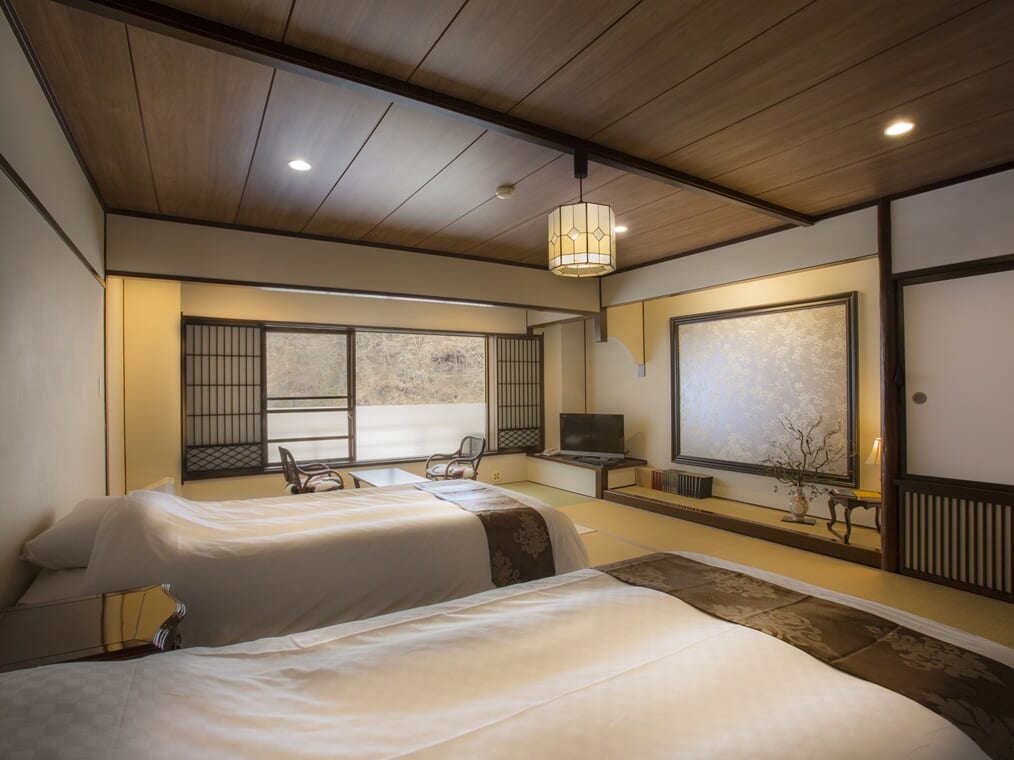 「泊まってみたい憧れの宿」で常に上位にランキングする「扉温泉 明神館」。ルレ・エ・シャトーに加盟を許された、数少ない日本の宿です。純和風の屋号ながら、和モダンの中にふたつのレストランやラウンジ、サロンやスパなどヨーロッパ的な雰囲気も兼ね備え、それが見事に調和しています。二間に分かれたゆったりとした客室もさることながら、食や温泉、すべてにおいて宿泊者を魅了。自慢の温泉は露天風呂付き大浴場・立ち湯・寝湯の3つがあり、趣の異なる湯でおくつろぎいただけます。地元の旬の食材をいかした夕食も楽しみです。