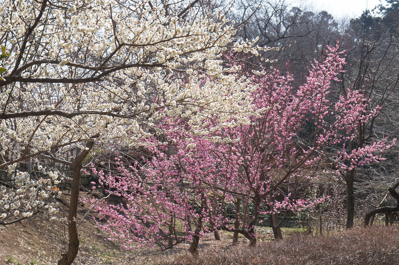 水戸に梅の木が多いのは、江戸時代に水戸藩主徳川斉昭が、観賞用だけでなく非常食としての梅の実の活用を考えて植樹を奨励したためです。偕楽園には約100品種3000本もの梅が植えられており、早咲き、中咲き、遅咲きと開花時期が異なるため、長い期間にわたって観梅を楽しめます。白梅、紅梅、一本の木に複数の色の花が咲く「咲き分けの梅」など、個性豊かな姿が魅力です。