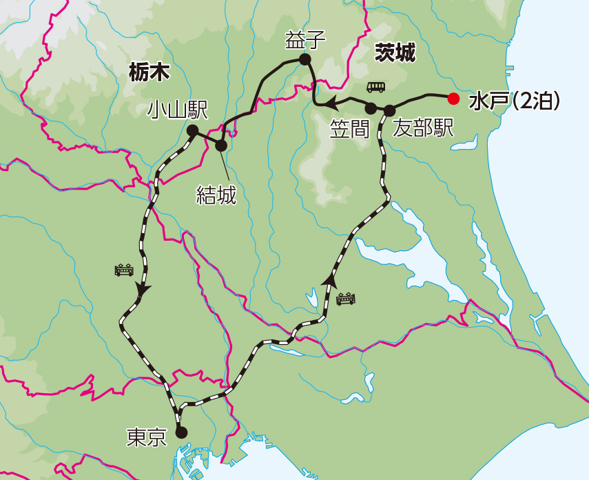 水戸09:00発 (益子) (結城) 小山駅17:33発 東京駅18:16着