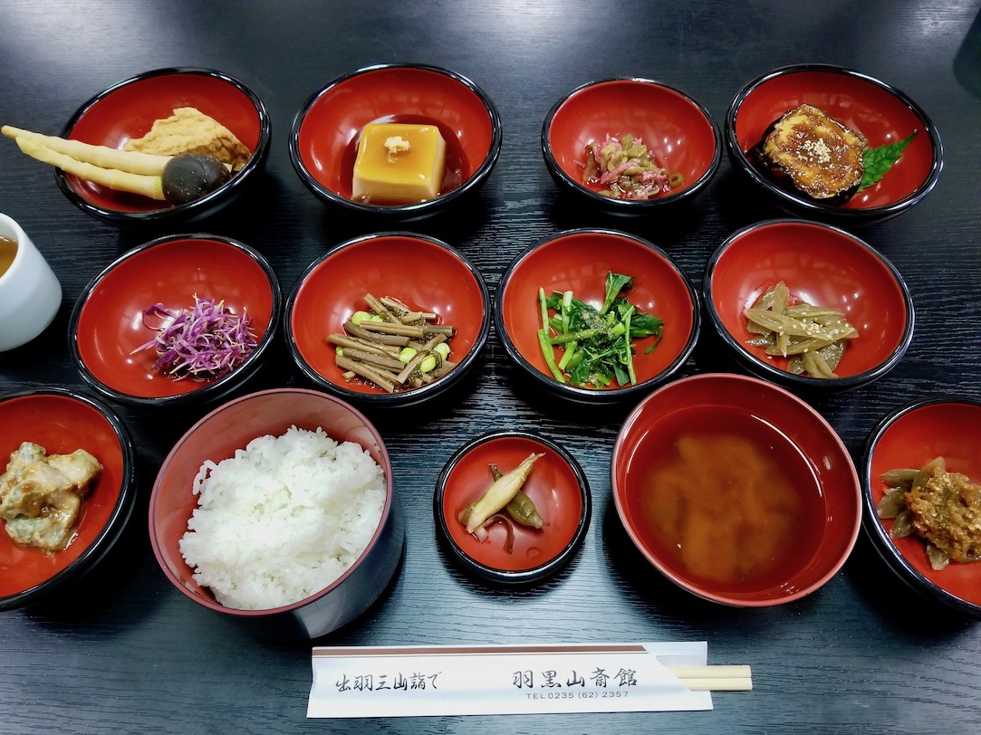 庄内平野を囲むように立つ出羽三山。月山、羽黒山、湯殿山は、それぞれ「過去」、「現在」、「未来」に例えられ、3つの山を参拝することで「生まれ変わりの旅」と呼ばれていました。この参拝の中心となっているのが、羽黒山に建つ「出羽三山神社」。かつてはこの神社を中心に「山籠所」と呼ばれる宿坊が30軒以上ありましたが、現在は1軒が残るのみ。その1軒が「斎館」として、現在も出羽三山ゆかりの「精進料理」を提供しています。庄内の食文化は、米を中心とした野菜類、日本海の海の幸、そして、この山伏の食文化の融合といわれます。奥の細道をゆく松尾芭蕉も立ち寄ったという「斎館」の山伏料理も、庄内ガストロノミーの一つです。併せてお楽しみください。