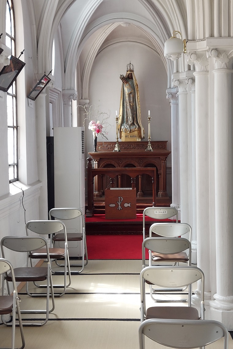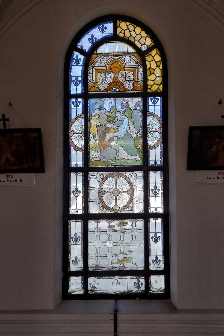 フランス人のパピノ神父の設計で、日本人の大工、相馬富太郎が棟梁となって建築しました。世界でも貴重な、日本で唯一といわれる「黒いマリア像」が安置され、この国独特の「畳の教会」となっています。また窓絵はステンドグラスの代わりに透明な紙に描いた聖画を2枚のガラスで挟んだもので、日本でもここでしか見られないものとなっています。