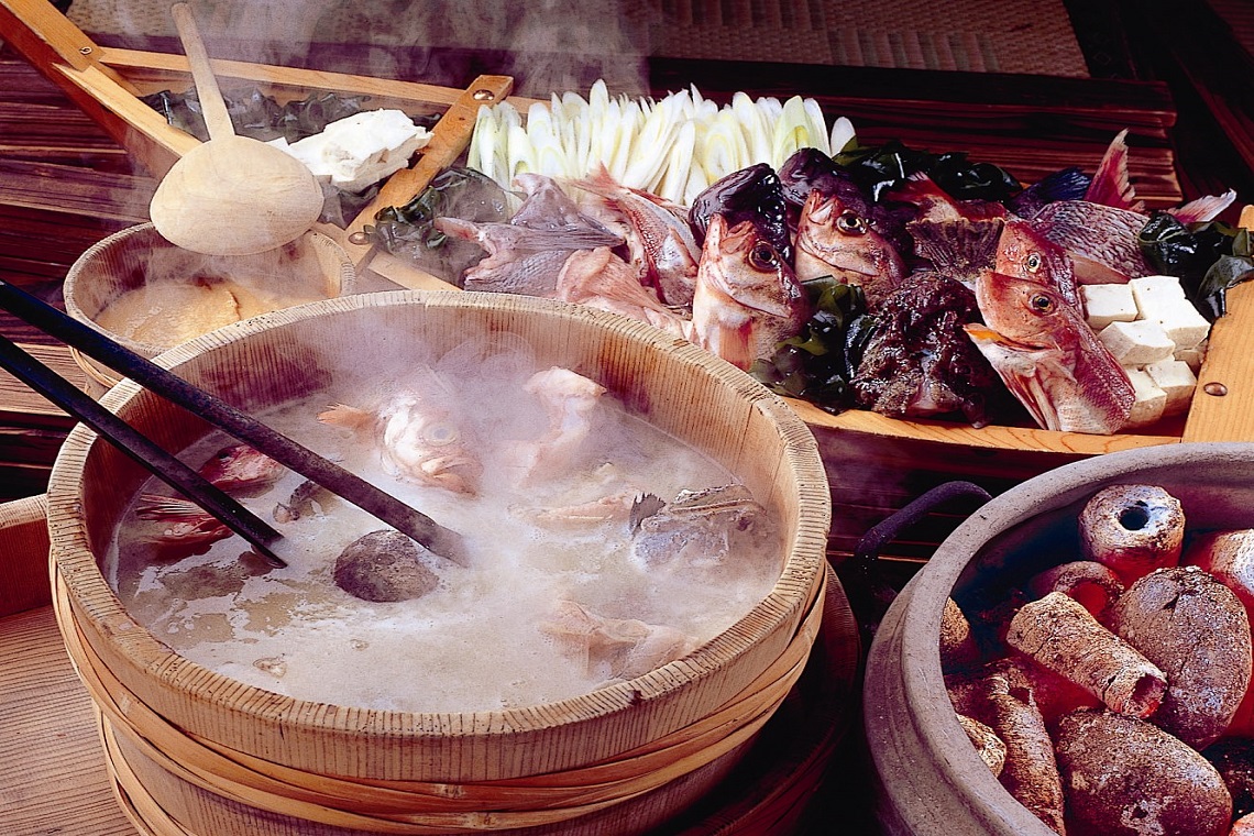 男鹿では、名物の石焼料理もご用意しました。味噌ベースのだし汁を、魚や海藻、ネギなどとともに桶に入れ、そこに炭火で熱した男鹿の火山岩を投入します。音と湯気をあげて瞬時に沸き上がる豪快な様子は、まさに「目で、耳で、舌で楽しむ」男鹿の名物料理。漁師の豪快で奔放な調理法ながら、新鮮な魚介類ならではの旨みがたっぷりです。