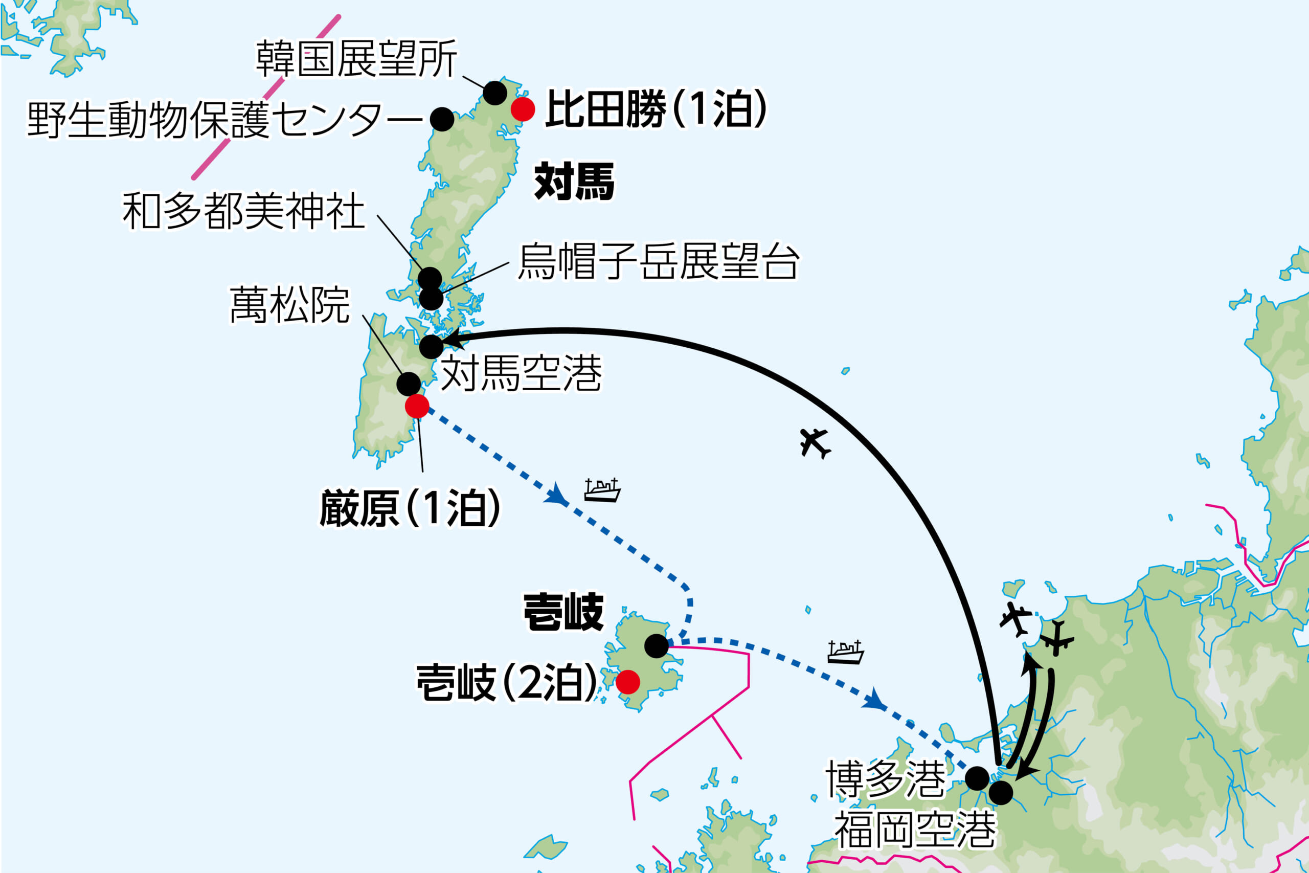 ※対馬では、道幅の関係上、中型バスを利用します。バス座席をお一人2席ご用意できない場合がございます。