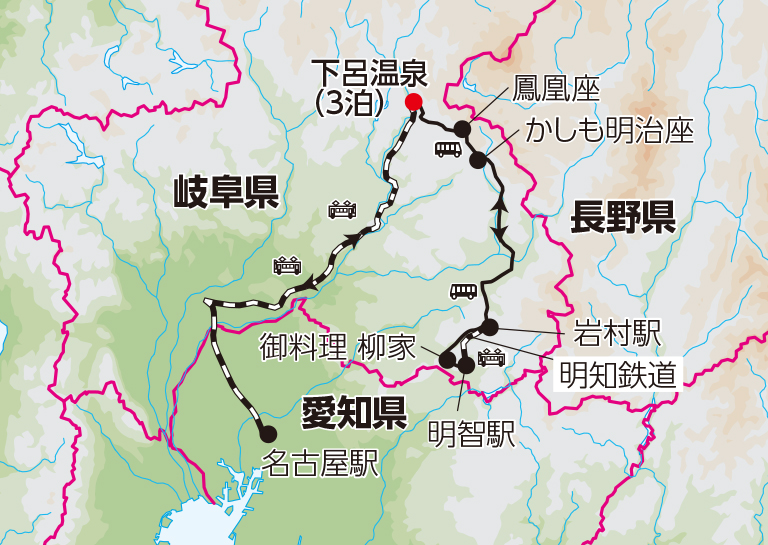■午前、地歌舞伎街道を通り、●かしも明治座を見学。 ■昼食は炉端焼きの名店「御料理 柳家」(注)にて。 ■午後、明智駅から岩村駅まで明知鉄道のローカル線乗車。 ■その後、城下町岩村の散策。 ■その後、バスにてホテルに戻ります。 (下呂泊) |