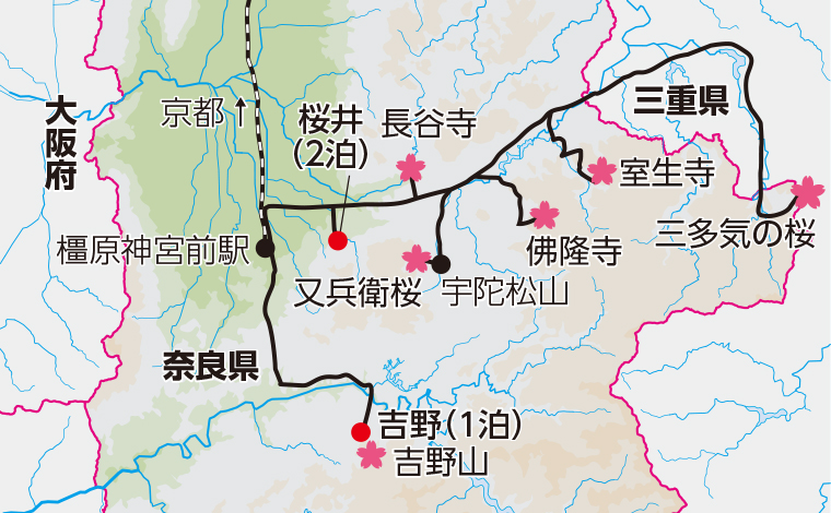 ■午前、樹齢900年を超えると言われる●佛隆寺の「千年桜」を訪問。 ■その後、奥吉野と三重の県境に位置する、棚田と桜の風景が美しい○「三多気の桜」を訪ねます。 ■午後、奈良の山里に建つ、五重塔と美しい仏像で知られる●室生寺を訪れます。 ■その後、桜井のホテルに戻ります。 (桜井泊) |