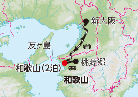 ■午前、江戸時代以降に大阪湾を守る要塞として位置づけられていた友ヶ島クルーズにご案内します。(約50分) ■午後は、「かおり風景100選」にも選ばれた桃の花でつくりだされる桃源郷へ。 ■観光後、和歌山駅に行き特急「くろしお」にて、新大阪駅へ。 ■着後、解散。 |