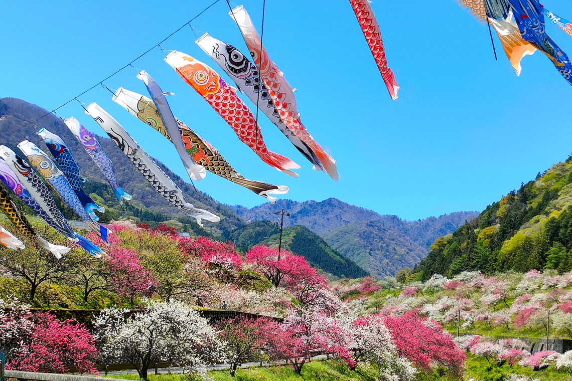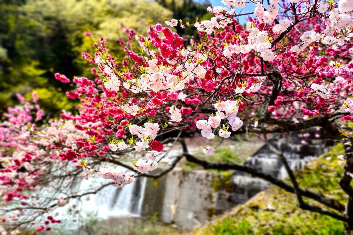 伊那谷の奥に位置する阿智村。この村を有名にしているのが花桃の里です。村の周辺には1本の木に紅白ピンクの3色の花が咲く三色花桃が1万本以上植えられ、例年ゴールデンウィーク頃には一面美しい花で覆いつくされます。咲き始めから満開の美しさもさることながら、花びらが散り、風に舞う様もとても絵になります。(注)
