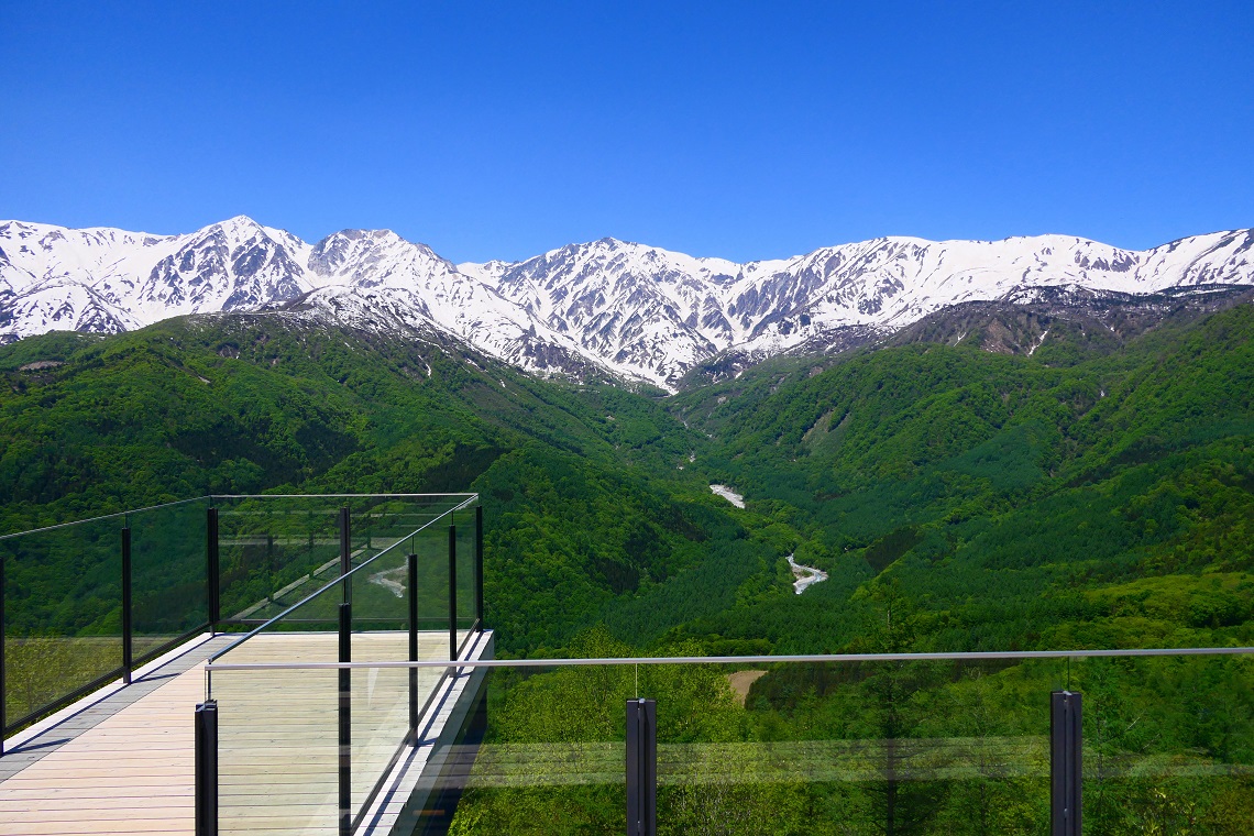 この季節、標高の高い山々ではまだスキーも楽しめる白馬周辺。山頂付近に設けられた絶景テラスへは、2024年冬にリニューアルされた最新ゴンドラで標高1289メートルまで一気に上がります。まるで山に飛び込んでいくようなテラスからは、2019年に氷河認定された「唐松沢雪渓」などの絶景を望めます。迫力あるアルプスをお楽しみください。