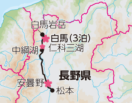 ■各地より松本駅に集合。 ■バスにて安曇野の春風景を訪ねます。 ■アルプスを背景にした桜の風景で知られる大町公園、芝桜の群生が見られる農具川河川公園を訪問。バスの車窓からは、水を張られた水田の風景が楽しみです。 ■その後、もう一つの桜のポイント、仁科三湖の○中綱湖へ。湖畔に咲く桜の風景を楽しみます。 ■夕刻、白馬のホテルへ。 【3連泊】(白馬泊) |