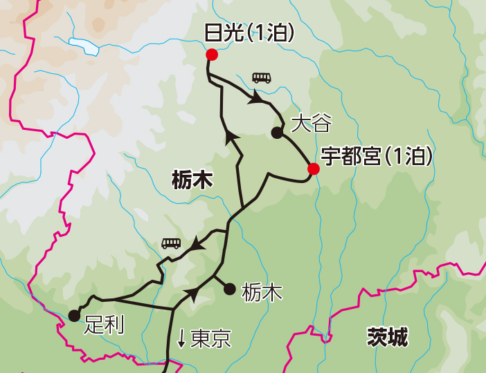■午前、東京駅を出発。バスにて栃木へ。 ■昼食は栃木で110年以上の歴史を持つ「割烹 仲乃家」にて。 ■午後、蔵の町栃木の散策。●横山郷土館にご案内します。 ■その後、日光へ。宿泊は「日光金谷ホテル」にて (日光泊) |
