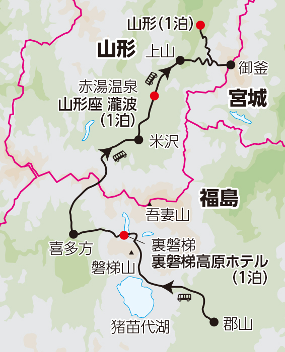 ■現地合流離団:郡山駅合流(出発)/山形駅離団(帰着) 旅行代金から¥18,000引きとなります。