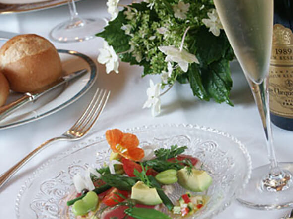 唐招提寺での御影堂特別拝観とともに楽しむのが、大河ドラマ「豊臣兄弟」で注目を集める、大和郡山です。今まで唐招提寺が位置する西の京や、奈良市内から近くにありながら、訪問する機会の少なかった大和郡山は、奈良県では珍しい城下町です。現在でも町を見下ろす大和郡山城址に足を運ぶと、天守跡や城壁、堀などが残り、遠くには東大寺の大きな屋根まで望むことが出来ます。城跡とともに大和郡山を訪れたら、ぜひ訪問したいのが奈良を代表するフランス料理レストラン「Le BENKEI」です。昨年で創業50周年を迎える、大和郡山城址にほど近い、昨年で創業50周年を迎えた一軒家レストランで、創業以来この地で地産地消の食材にこだわり、奈良の西洋料理を支える老舗です。オーナーシェフの尾川欣司氏は、平成29年度に春の叙勲 旭日中綬章受賞。国際観光日本レストラン協会名誉会長としても活躍中です。今回は評判のランチコースをお楽しみいただく予定です。