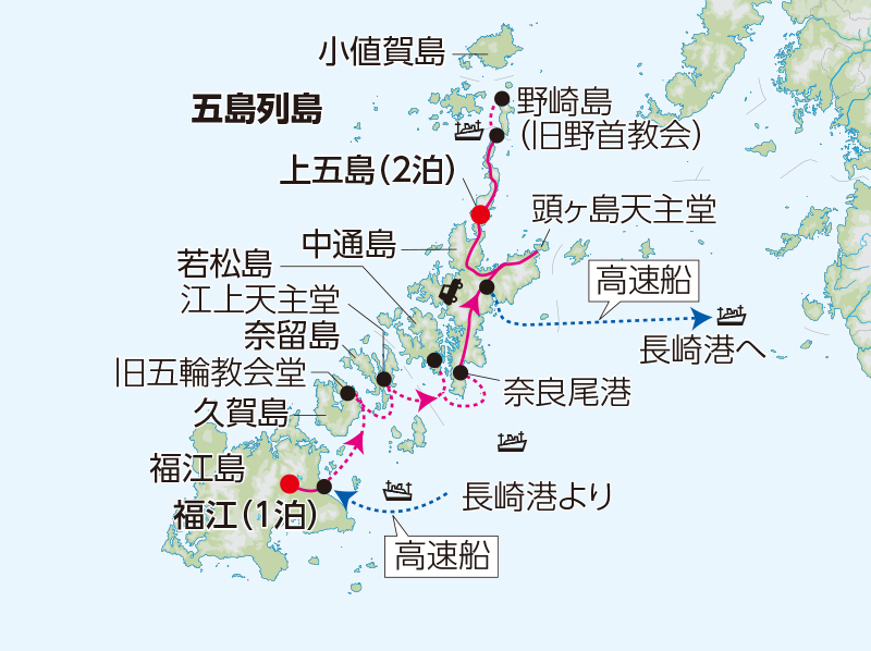 ■午前、福江島の教会巡りにご案内します。●堂崎天主堂、○水ノ浦教会、○貝津教会などを訪ねます。 ■午後、福江港よりチャーター船にて上五島へ。久賀島の○旧五輪教会堂、奈留島では○江上天主堂を見学し、若松島のキリシタン洞窟は船上からご覧いただきます。 ■上五島を代表するリゾートホテル「マルゲリータ」に連泊です。 【2連泊】(上五島:マルゲリータ泊) |