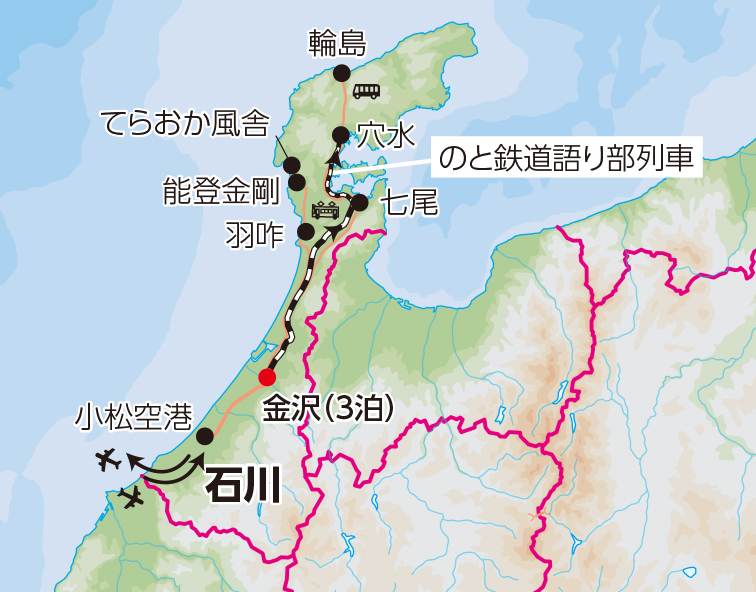 ■午前、金沢より特急にて能登へ。 ■その後、七尾より「のと鉄道語り部列車」に乗車します。 ■穴水着後、輪島へ。池端シェフが手掛ける復興食堂「mebuki ー芽吹ー」にて昼食。 ■午後、●輪島キリモトを訪ねます。 ■夕刻、金沢に戻ります。 (金沢泊) |