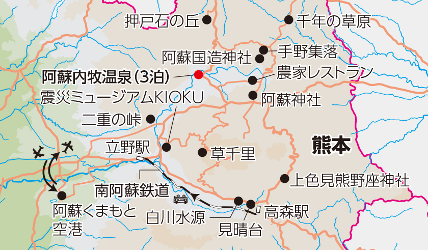 阿蘇内牧温泉09:00発 上色見熊野座神社 高森 白川水源 高森駅 午後発 南阿蘇鉄道の旅 立野駅 午後着 震災ミュージアムKIOKU 立野峡谷 阿蘇内牧温泉17:00着