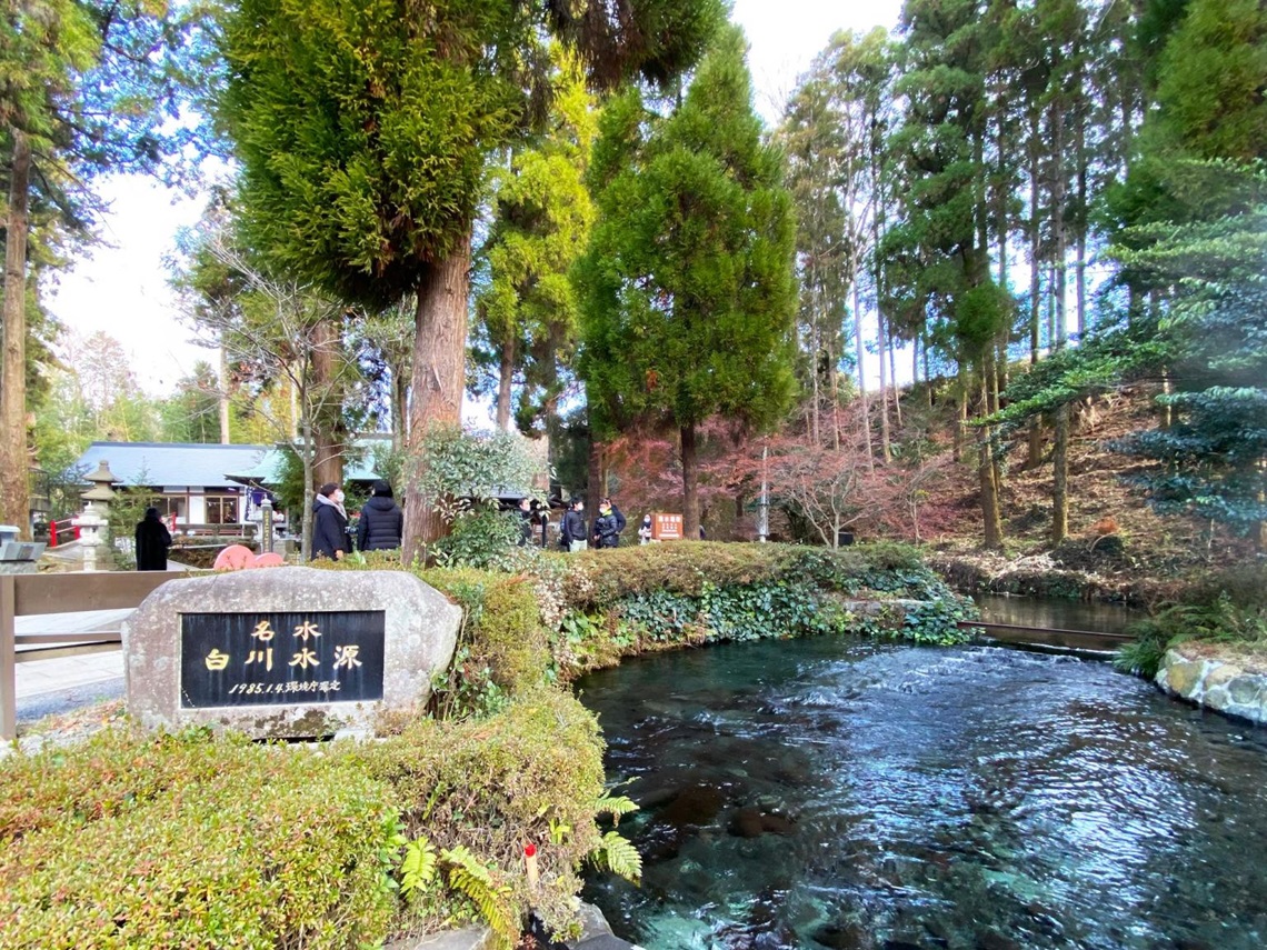 ■午後、湧水の里、○白川水源へ。●高森湧水トンネルや、名水と阿蘇の米で仕込む銘酒「れいざん」の●酒蔵を見学。