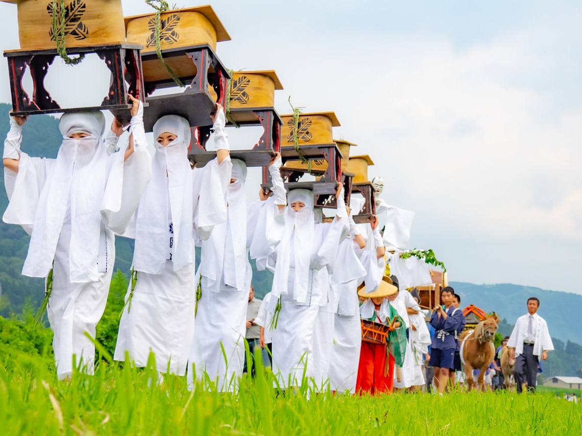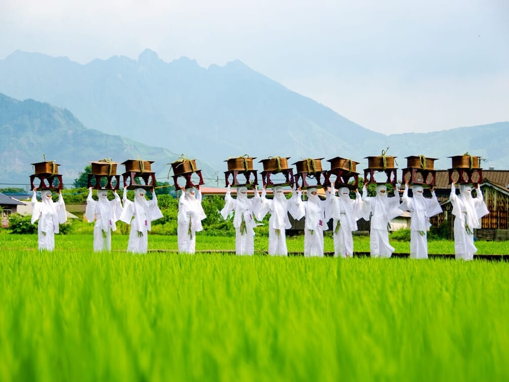7月発は、阿蘇神社で行われる「御田(おんだ)祭り」に合わせました。阿蘇神社にまつられる12の神が4基の神輿に乗って行列し、神社周辺の青田の状況を見て回る田植えの祭りです。白装束に身を包んだ宇奈利(うなり)たちが、青々とした水田の横を行列する姿は、まさに「日本旅百景」そのもの。阿蘇の夏の風物詩となっています。