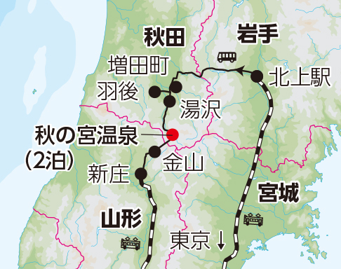 ■現地合流離団:北上駅合流(出発)/新庄駅離団(帰着)   旅行代金より¥25,000引きとなります。