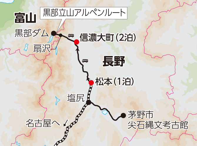 信濃大町 (仁科神明宮) 信濃大町駅 14:10発 松本駅 14:47着 14:54発 名古屋駅 17:07着 17:41発 新大阪駅 18:30着
