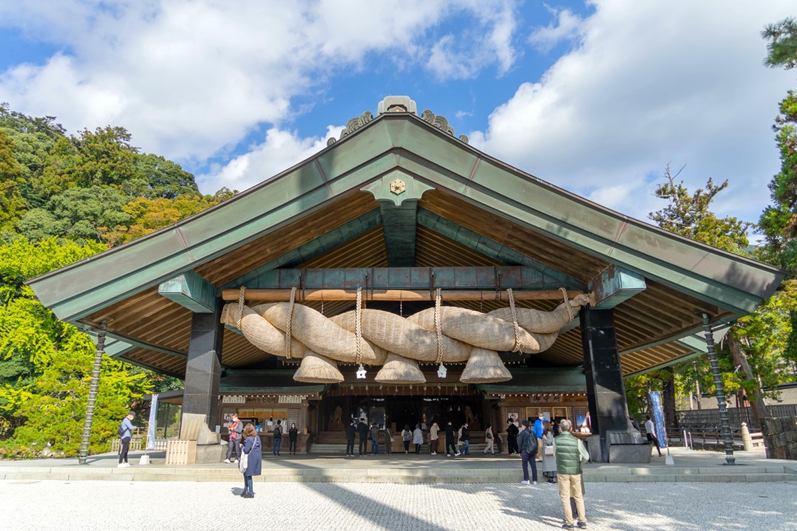 「八雲立つ出雲の国」と呼ばれ、神の国、神話の国として知られる出雲。その中心として鎮座しているのが、大国主大神をお祀りする出雲大社です。近年は縁結びの神、福の神として全国各地、世界からも多くの参拝客が訪れています。このたびは出雲大社へ、地元の足として親しまれる「一畑電車」で訪れます。松江の宍道湖畔にある小さな「松江しんじ湖温泉駅」より乗車。宍道湖の風景を愛でながら、約50分間のレトロ電車の旅です。下車する「出雲大社前駅」は、出雲大社の参道の中。参道の賑わいを楽しみながら出雲大社へ。一味違った出雲大社訪問です。