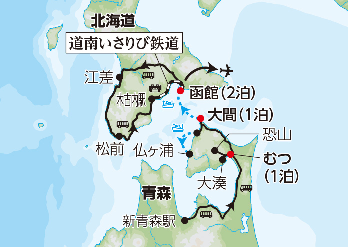 - 函館での宿泊は立地の良い「函館国際ホテル」をご用意。いさりび鉄道にも体験乗車し、江差、松前も訪れます。