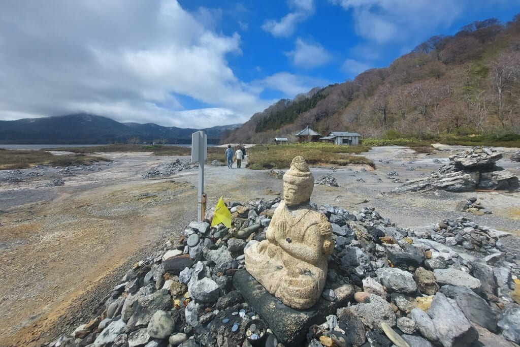下北半島のほぼ中心に位置する恐山。比叡山、高野山とともに日本三大霊場の一つで、862年に慈覚大師円仁によって開山され、曹洞宗の菩提寺となっています。菩提寺、地蔵殿の参拝とともにぜひご覧いただきたいのが、菩提寺境内に造られた地獄、極楽めぐりです。宇曽利湖畔の火山岩と白砂が織りなす景観は、最果ての下北半島を代表する風景の一つです。