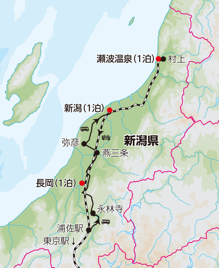 ■午前、村上の城下町散策にご案内します。 ■午後、村上からJR特急にて新潟へ。 ■新潟駅から新幹線にて東京駅へ。 ■東京駅着後、解散。 ご自宅までお荷物を託送します。 |
