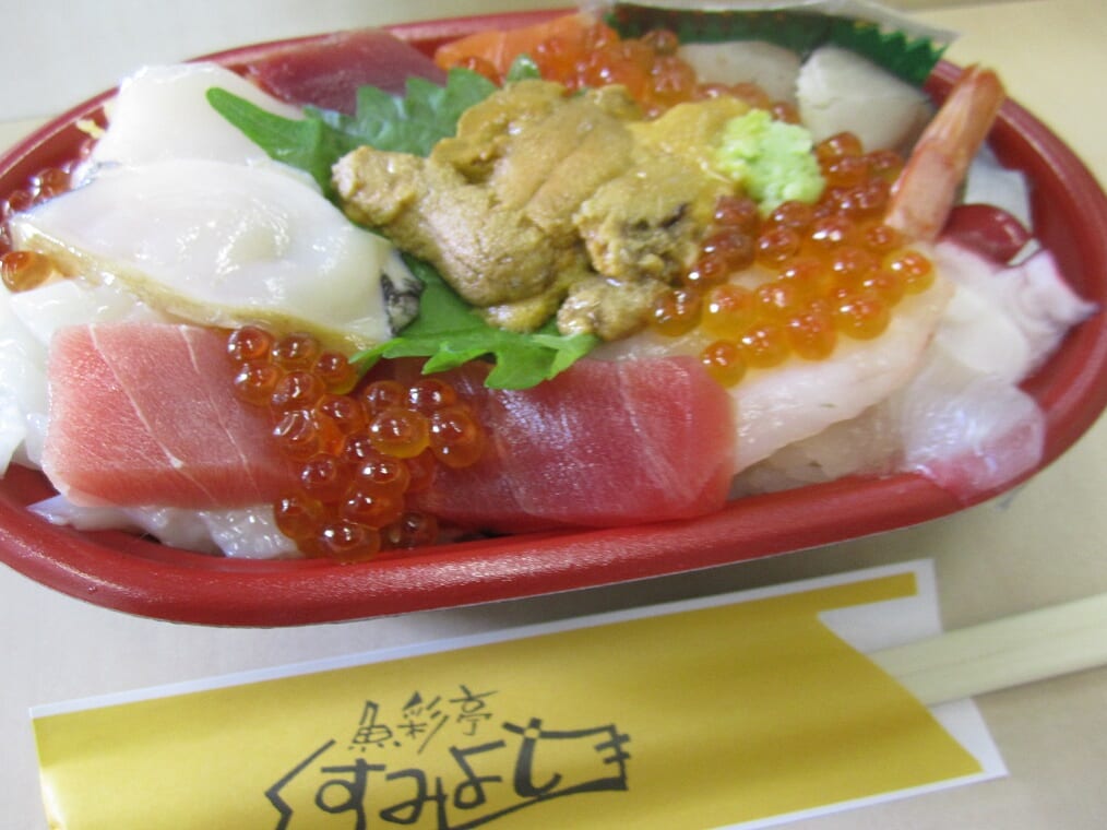 三陸海岸に行ったらぜひ味わいたい海鮮料理。三陸鉄道の名物のひとつ「海鮮弁当」を、三陸鉄道乗車の際にご用意しました。通常は駅弁として販売されているものですが、駅弁ではどうしても新鮮さに欠けるということで、このたびは地元の海鮮料理店にてご用意。宮古駅から乗車の際、車内に仕出ししてもらう運びとしています。