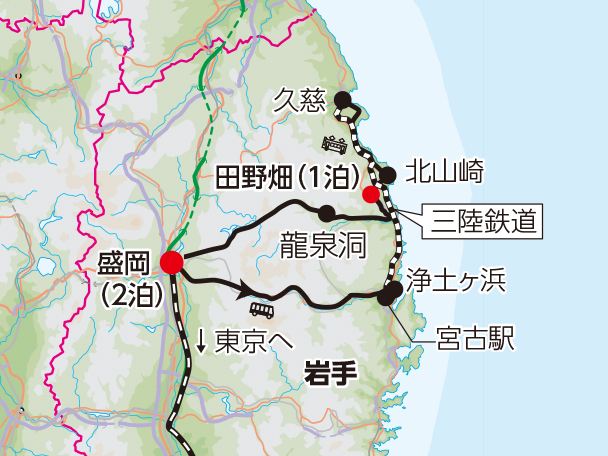 田野畑08:00発 (北山崎) (龍泉洞) 盛岡駅15:50発 東京駅18:04着