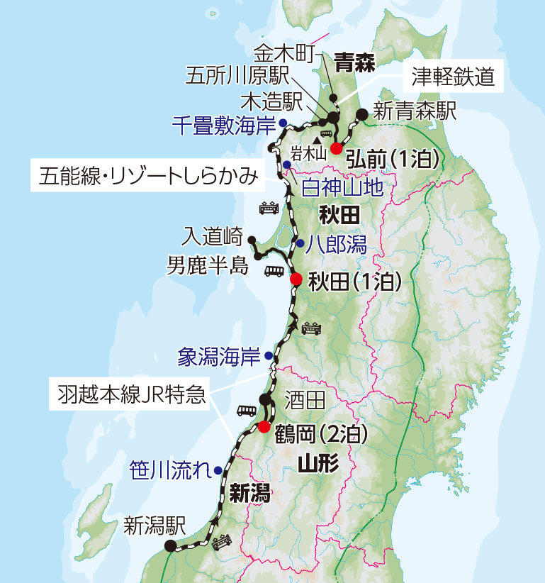 - 日本海の美しい海岸線が印象的な東北を代表する絶景路線、羽越本線と五能線に乗車します
